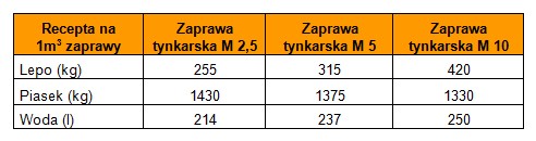 Podstawą zaprawy tynkarskiej jest odpowiednie dobranie proporcji poszczególnych składników, tak żeby uzyskała ona właściwą konsystencję. Aby zaprawa spełniała wszystkie wymagania, należy zawsze stosować dobre jakościowo składniki. Podczas jej zarabiania należy pamiętać o odpowiedniej kolejności mieszania – cement, piasek i 2/3 części wody mieszamy w pierwszej kolejności. Następnie powoli dolewamy resztę wody, aż do uzyskania wymaganej konsystencji. Należy pamiętać, że gotowa zaprawa utrzymuje swoje właściwości przez około 3 godziny. Po upływie tego czasu należy ją bezwarunkowo wyrzucić. Niedopuszczalne jest również dodawanie wody w celu jej ponownego użycia. To grozi niedostateczną wytrzymałością tynku, a co za tym idzie jego uszkodzeniem, pękaniem oraz odpadaniem.