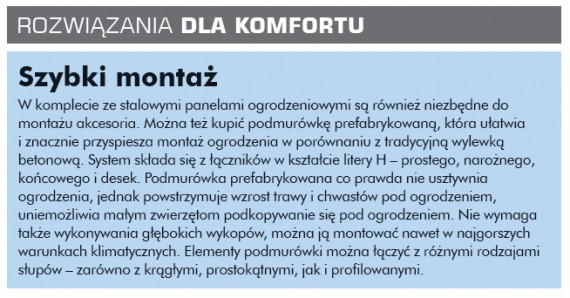 Ogrodzenia metalowe. Tradycyjne siatki stalowe mocowane do metalowych słupków są dzisiaj wypierane przez ogrodzenia z gotowych paneli stalowych albo aluminiowych. To kompletne systemy ogrodzeniowe z gotowych paneli różnej wysokości (od ponad 60 cm do ponad 2 m) i szerokości (2-3 m). Są bardzo trwałe i zapewniają wysoki poziom sztywności. Mocuje się je do stalowych słupków, niekiedy w zestawie są też montowane poprzecznie u góry i u dołu kątowniki. Panele mają nowoczesną prostą stylistykę, w niczym nieprzypominającą tradycyjnej siatki. Paneli nie trzeba już malować. Są wykonywane z ocynkowanych drutów i zabezpieczone antykorozyjnie powłoką PCW. Mają kolorystykę zieloną, antracytową, czarną, białą, można też zamówić pomalowanie ich na dowolny kolor z palety RAL. Także słupy są ocynkowane wewnątrz i na zewnątrz, a następnie pokrywane proszkiem poliestrowym. Do ogrodzenia można dokupić bramy wjazdowe skrzydłowe lub przesuwne, mają one takie samo wypełnienie jak elementy ogrodzenia. Dzięki niewielu koniecznym do montażu akcesoriom taki system jest szybki i nie wymaga profesjonalnego przygotowania. Z elementów drewnianych. Kształt i sposób wykończenia drewnianych elementów jest zazwyczaj bardzo prosty. Wykonuje się je z drewnianych szczebli, żerdek czy poziomo umieszczonych desek (tarcicy). Do budowy ogrodzeń często wykorzystuje się elementy z dość taniego drewna sosnowego, jodłowego, świerkowego, olchowego bądź osikowego. Rzadziej stosuje się droższe drewno jesionowe, wiązowe, akacjowe, dębowe i modrzewiowe, choć jest ono twardsze i odporniejsze na warunki atmosferyczne. Z drewna modrzewiowego wykonuje się często tylko słupki, a elementy wypełnienia są już z drewna niższej jakości. Ogrodzenia można wykonać także z gotowych drewnianych przęseł i paneli. Panele składają się z drewnianej ramy wypełnionej drewnianymi listwami. Wymiary paneli zazwyczaj wynoszą (wysokość, szerokość) 180x180 cm, 180x120 cm, 180x90 cm. Można też kupić panele o mniej typowych wymiarach, np. 150x180 cm, 100x180 cm. Zazwyczaj są wykonane z drewna sosnowego, świerkowego, struganego, najczęściej są zaimpregnowane ciśnieniowo, dzięki czemu nie trzeba ich dodatkowo zabezpieczać, są też bardziej trwałe. Mogą być proste lub zakończone łukowo, pełne, ażurowe tylko u góry lub w całości. Dostępne są także panele żaluzjowe – ich listwy są montowane pod kątem ostrym.